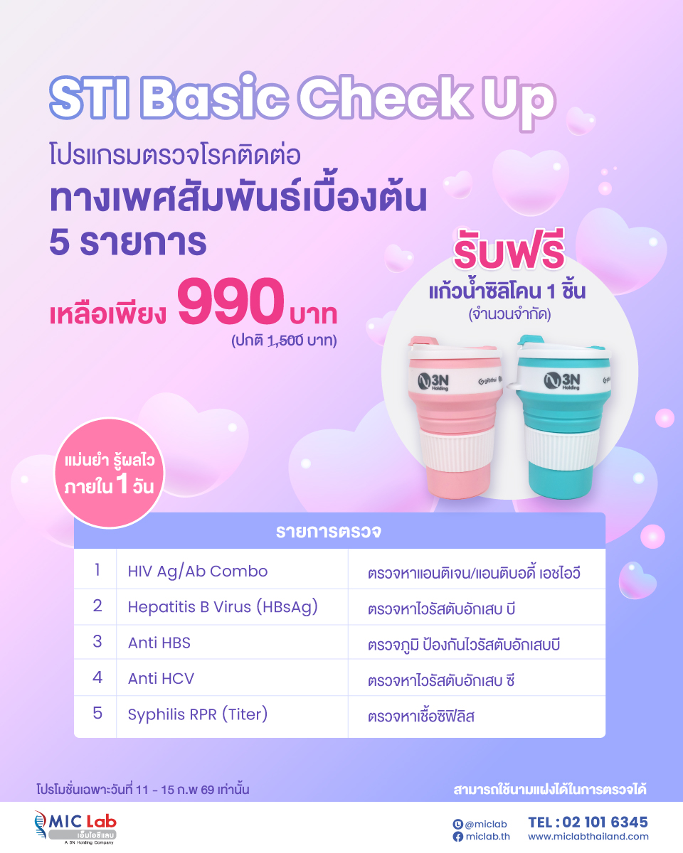 - โปรแกรมตรวจโรคติดต่อทางเพศสัมพันธ์เบื้องต้น 5 รายการ เพียง 990 บาท (ปกติ 1,500 บาท)