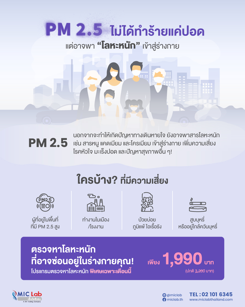 รู้อะไรไหม P.M 2.5 ไม่ได้ทำร้ายแค่ปอดแค่อย่างเดียว แต่อาจเป็นตัวพาหะที่นำ “โลหะหนัก”เข้าสู่ร่างกายคุณ ! โลหะหนักที่มากับฝุ่น PM2.5 เช่น สารหนู,แคดเมียม,โครเมียมเมื่อสะสมในร่างกาย อาจเพิ่มความเสี่ยง โรคหัวใจ,มะเร็งปอด,ปัญหาสุขภาพอื่น ๆ ตามมา